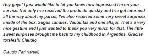 ''Hey guys! I just would like to let you know how impressed I am by your service. Not only did I received the products quickly and was informed all the way about my parcel, but I have also received some very sweet surprises inside the box: Sugus candies, Vauquitas and one alfajor. That's a very nice gesture and I just wanted to thank you very much for that. The little sweet surprises brought me back to my childhood in Argentina. ¡Gracias totales!''