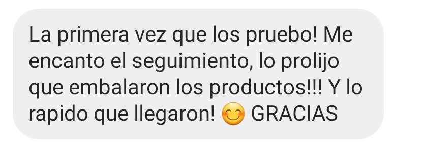 ''¡Es la primera vez que los pruebo! ¡Me encantó el seguimiento, lo prolijo que embalaron los productos, y lo rápido que llegaron! GRACIAS.''